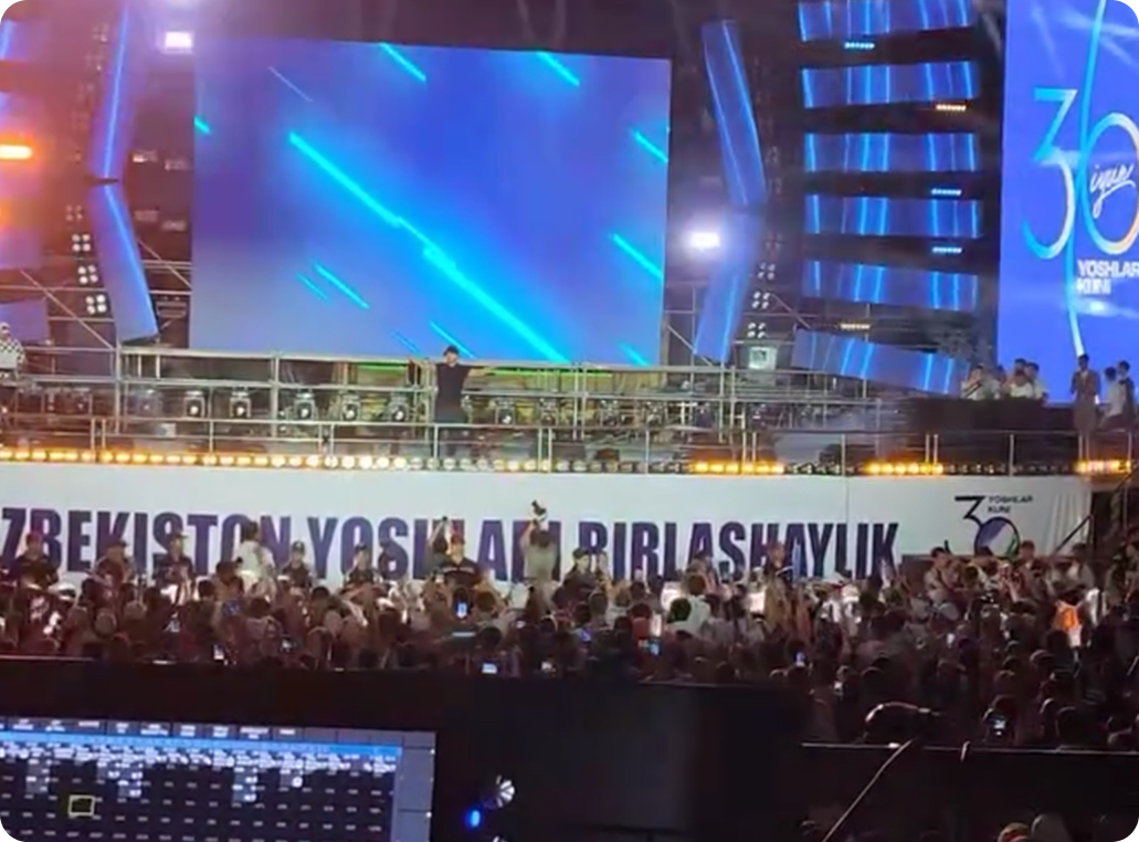 On June 19, 2024, we provided full technical support for the Namangan Youth Festival. A 100 m² stage, 150 m² LED screen, and 200 professional lighting units were installed. The 50 kW sound system ensured clear and powerful sound for the artists and audience. Our team completed setup, management, and technical support for the entire festival.