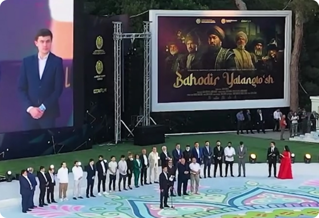 2024 yil 25-26 mayda Samarqandda "Yalangtush Bahadur" filmi premerasi uchun to'liq texnik yordamni taqdim etdik. 164 m² LED ekran o'rnatilib, sahna va vizual kontentning markaziy qismi bo'ldi. Bundan tashqari, 64+ yoritish qurilmalari va maxsus effektlar, masalan, feyerverklar va LED Super Jetlar, immersive tajriba yaratdi. Jamoamiz o'rnatish, boshqarish va texnik yordamni amalga oshirdi.